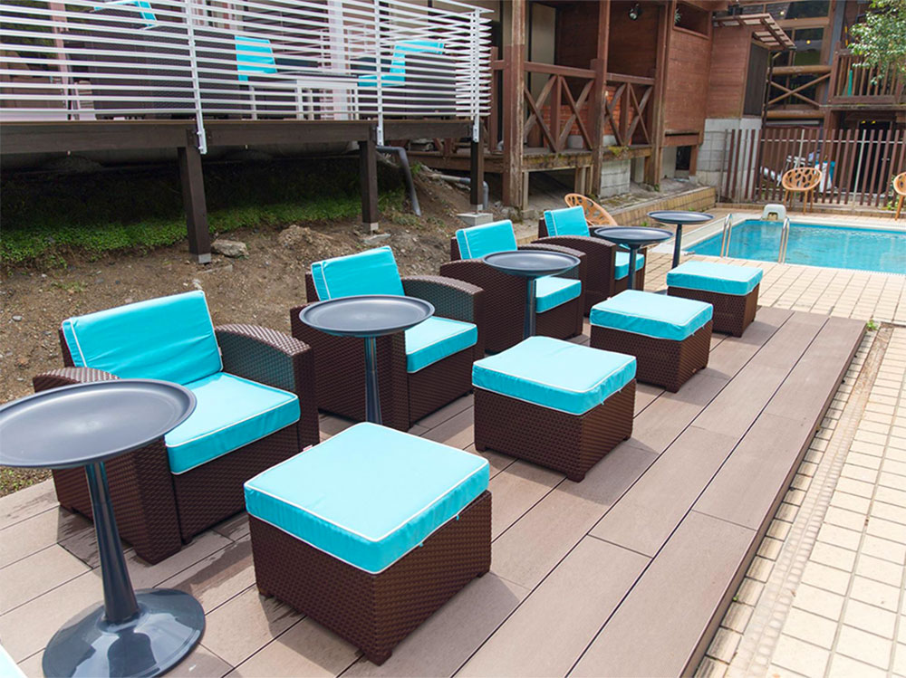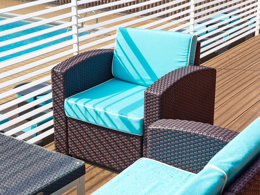 Для зоны бассейна использовали кресла от Итальянского производителя, из серии Premium столики Step. По проекту, выбранная мебель универсальна и подходит по размерам для заполнения площади террасы возле бассейна, а дизайн и плетение с имитацией ротанга идеально для уличного отдыха. В комплекте идут яркие и мягкие подушки, которые отлично завершают образ и создают необычную атмосферу.